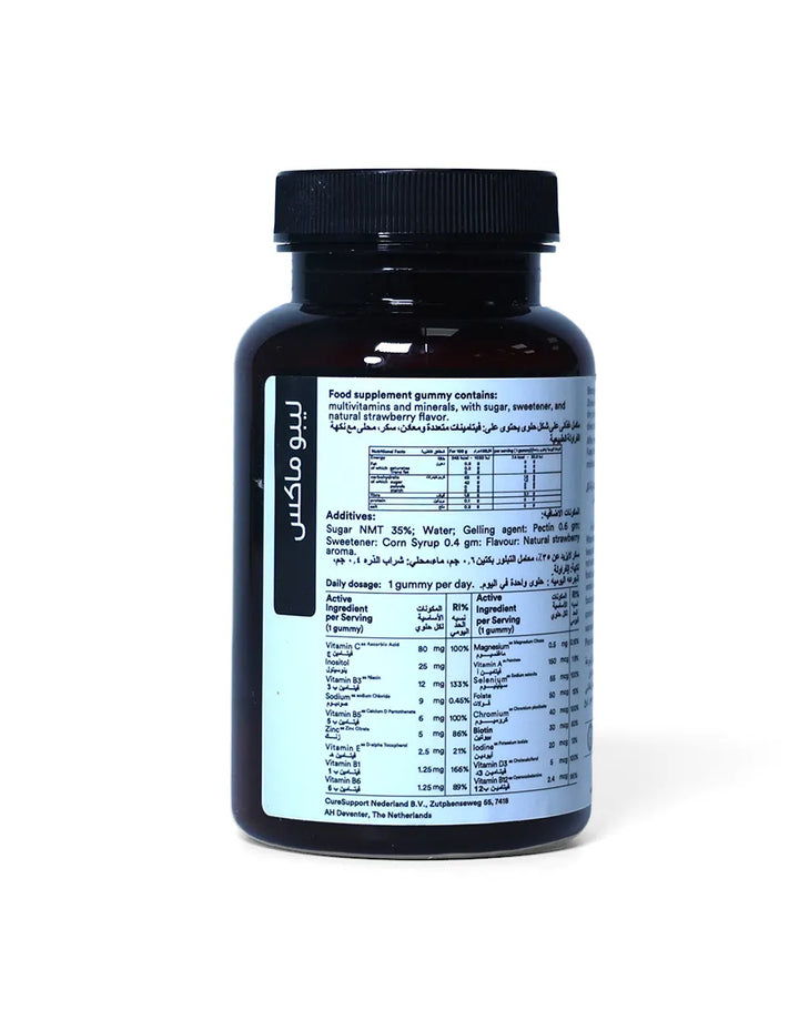 يحتوي ليبو ماكس على مزيج من ١٨ نوعًا من الفيتامينات والمعادن الأساسية، بنكهة الفراولة الطبيعية اللذيذة.ليبوماكس غني بالفيتامينات والمعادن ومضادات الأكسدة التي تدعم صحة الجسم، وتدعم النمو والتطور الصحي، وتوفر دعمًا مضادًا للأكسدة، وتساعد على تقوية جهاز المناعة، وتزود الأطفال بالعناصر الغذائية الأساسية التي قد يفتقرون إليها في نظامهم الغذائي.توفر كل حصة للطفل أهم العناصر الغذائية الأساسية، بما في ذلك الزنك وفيتامينات أ، ج، د٣، وهـ. صُمم ليبو ماكس لدعم صحة الأطفال النشيطين والمتحمسين. كما يساعد في نمو والحفاظ على صحة العظام والأسنان والبشرة والمناعة.