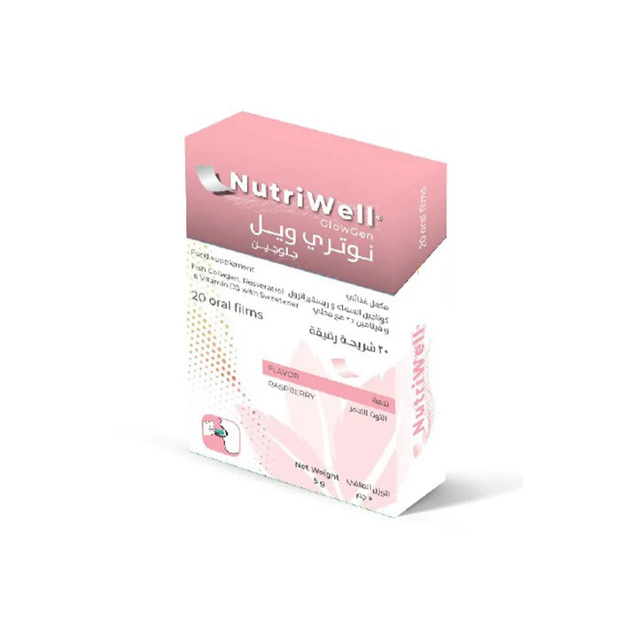 نيوتري ويل®️ جلو جين، تركيبة مبتكرة متعددة العناصر الغذائية فيلم سريع اللأمتصاص ، كولاجين، الشاي الأخضر، وريسفيراترول. يدعم إشراقة البشرة ويقلل التجاعيد .