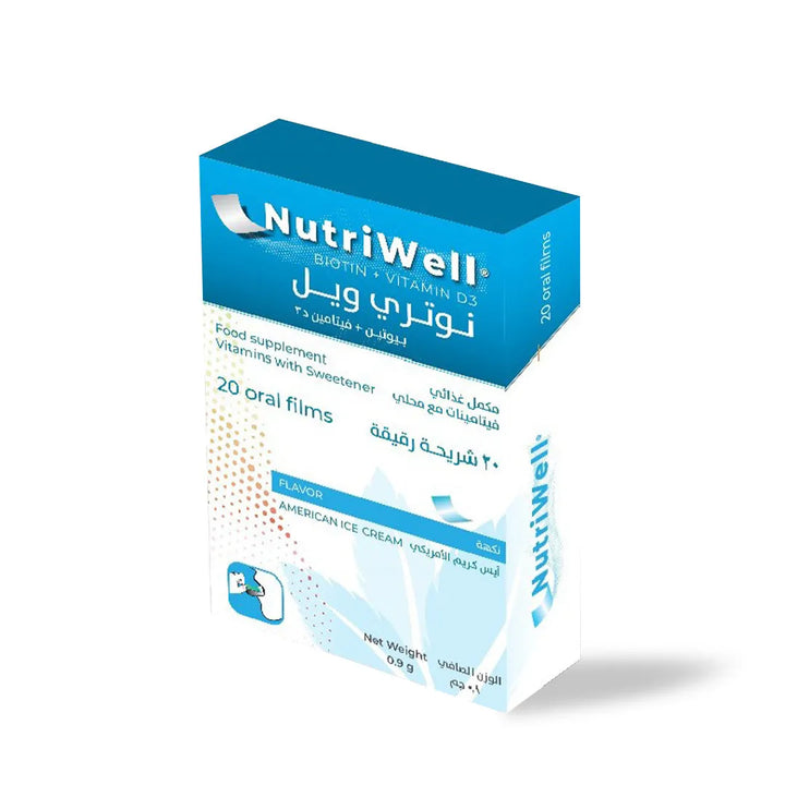 نيوتري ويل®️ بيوتين + فيتامين د3، فيلم مبتكر سريع اللأمتصاص يجمع البيوتين مع حمض الفوليك الأساسي وفيتامين د3، لدعم صحة الشعر والبشرة والأظافر. بنكهة الآيس كريم الأمريكية.