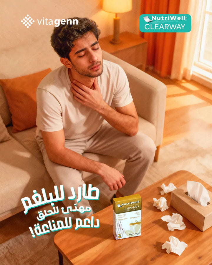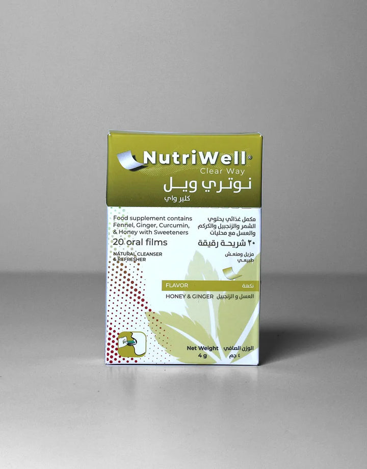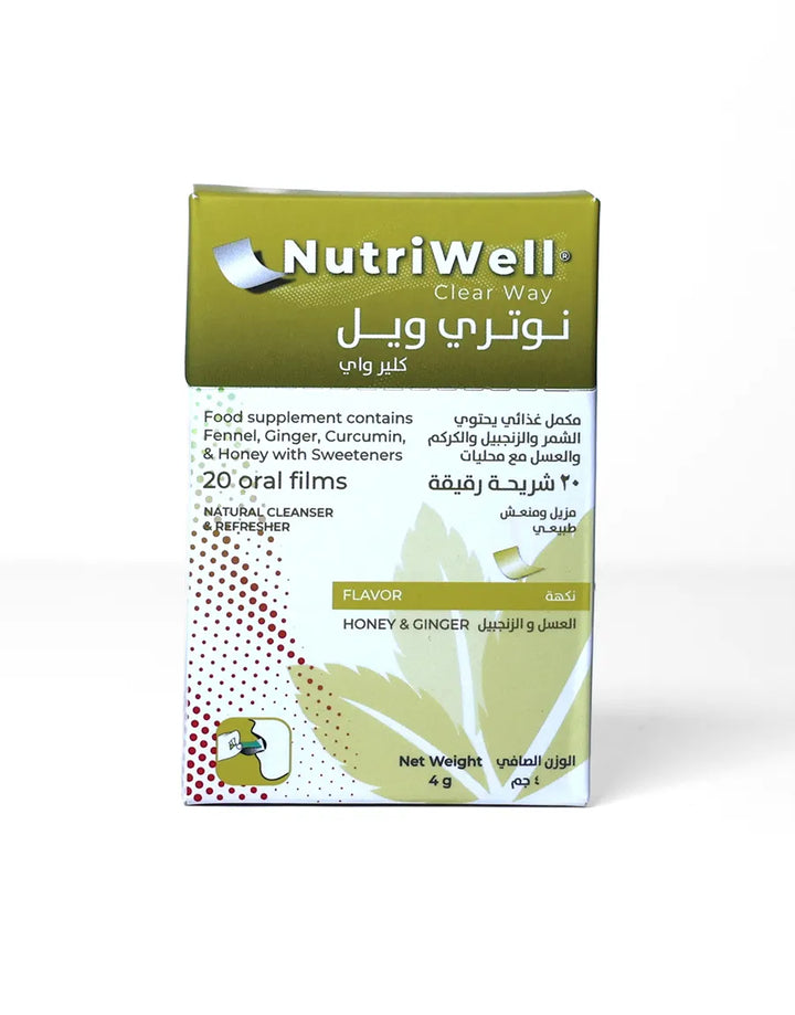 نيوتري ويل®️ كلير واي، مكمل غذائي مبتكر فيلم سريع الامتصاص ، مزيج من الزنجبيل، الشمر، الكركمين، والعسل، والمعروفة بقدرتها على طرد للبلغم و مذيب للأفرازات المخاطية.