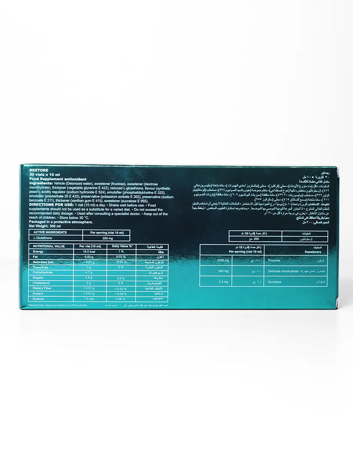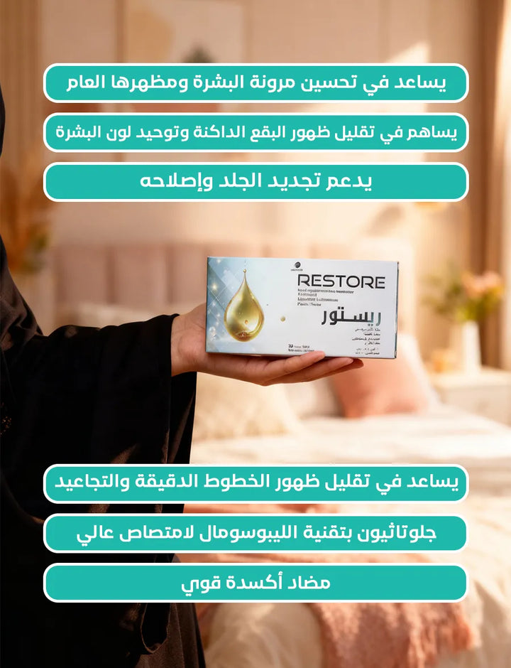 ريستور, جلوتاثيون بتقنية الليبوسومال المتطورة ، مضاد أكسدة قوي يساعدعلي تفتيح البشرة، ومكافحة علامات تقدم السن، وتنقية الجسم